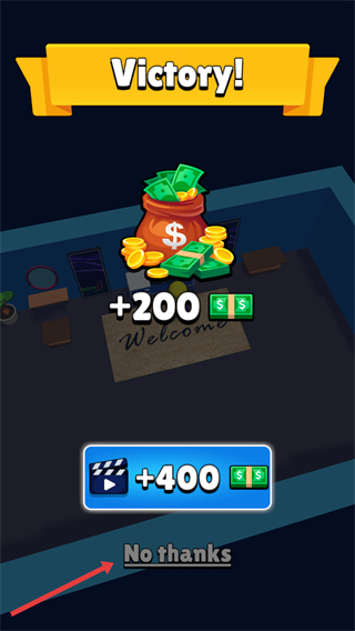 4、关卡胜利后,可选择【No-thanks】按钮跳过奖励翻倍提示,领取200美元奖励,继续挑战后续关卡。