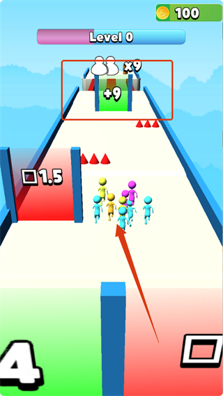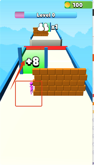 2、游戏中操控小人前进,通过绿色区域可增加人数,注意躲避砖块障碍,不断扩充队伍规模。