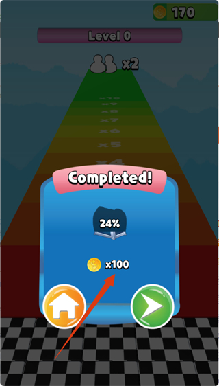 4、关卡完成后,可获得金币奖励,点击绿色箭头按钮继续挑战,积累金币提升等级和收益。