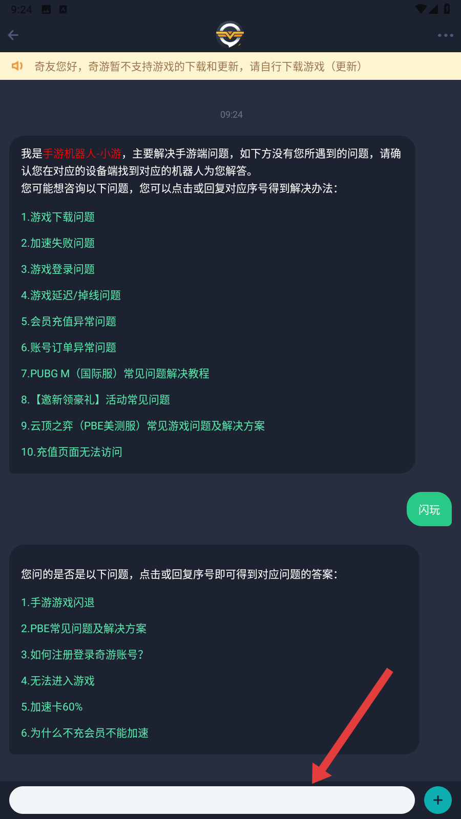3、进入客服界面后,点击底部输入框,可输入对应问题序号或直接描述问题来咨询哦。