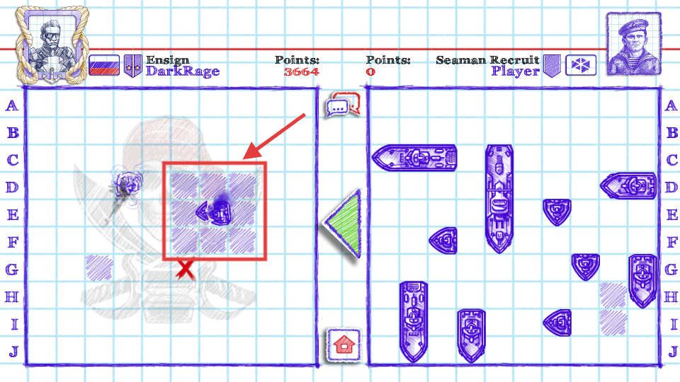 2、在方格记事本背景的海战场景里,用圆珠笔风格的美术设计,把战舰、轰炸机和爱国者导弹放在特定位置,布局自己的策略。