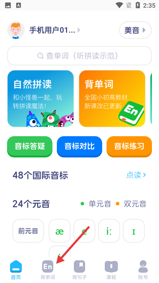 1、进入软件的首页可以看见有20个元音、28个辅音以及自然拼读、单词书等等。
