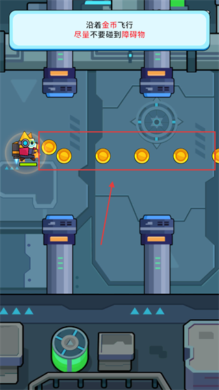 2、沿着金币排列路径飞行,躲避两侧障碍物保持节奏,获取更多金币提升自身能力。