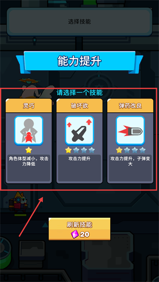 3、战斗间隙选择【弹药改良】技能,可增加攻击力和子弹大小,有效提升作战效率。