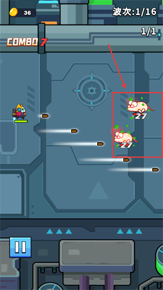1、点击屏幕调节角色水平位置,自动发射子弹,及时调整位置避开敌方火力,减少伤害。