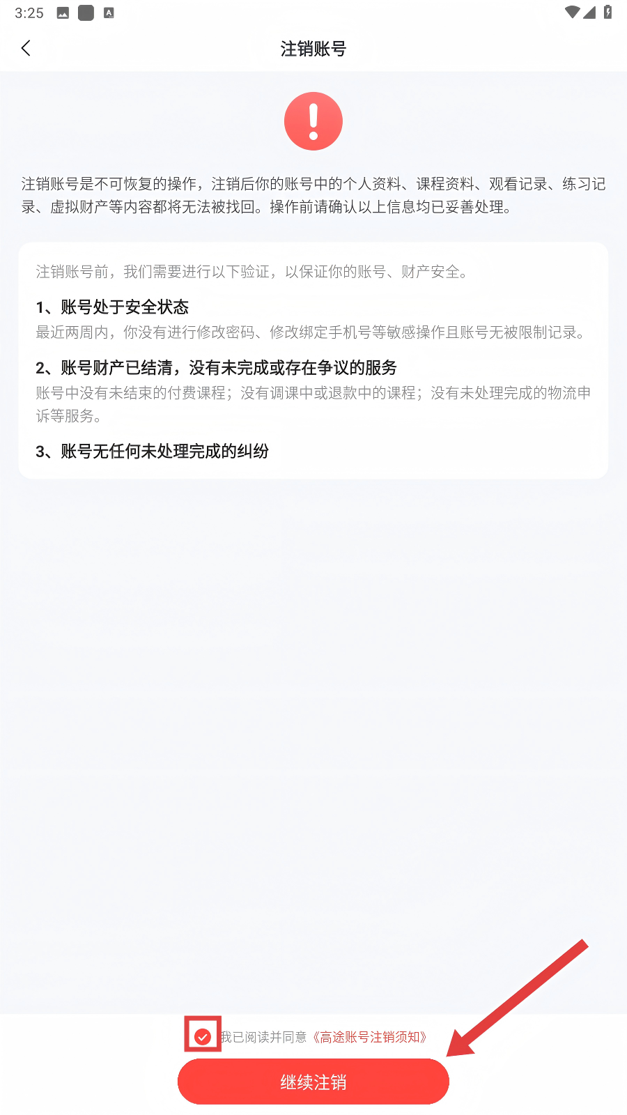 4、仔细阅读注销须知后,勾选【我已阅读并同意高途账号注销须知】,再点击【继续注销】就好啦。
