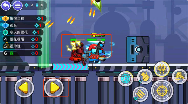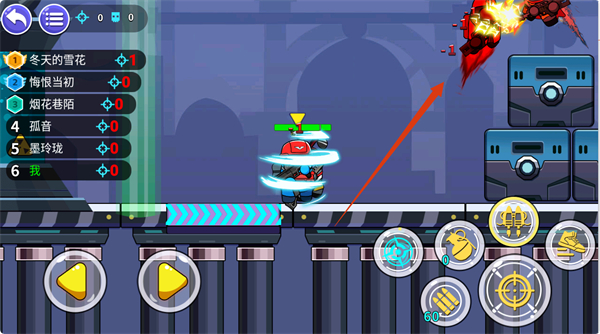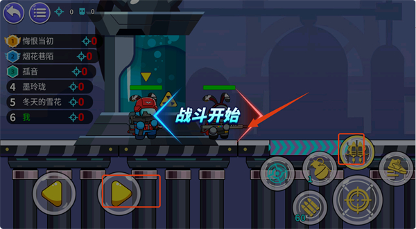 2、战斗开始时,操控角色移动,合理使用右侧技能按钮,如火箭等,发起攻击,争夺对战优势。