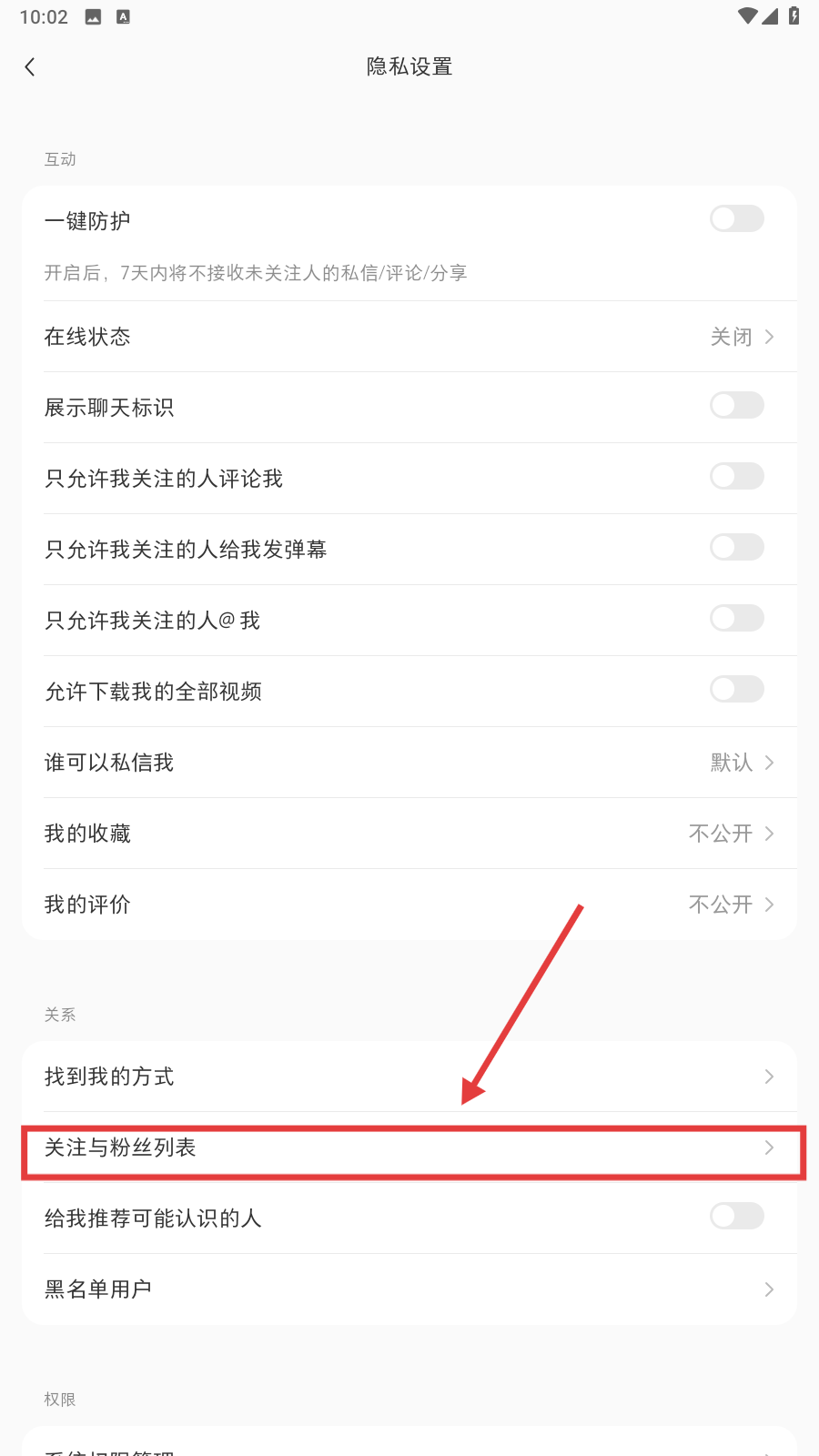 3、进入隐私设置页面后,我们找到【关注与粉丝列表】选项并点击,继续后续操作哦。