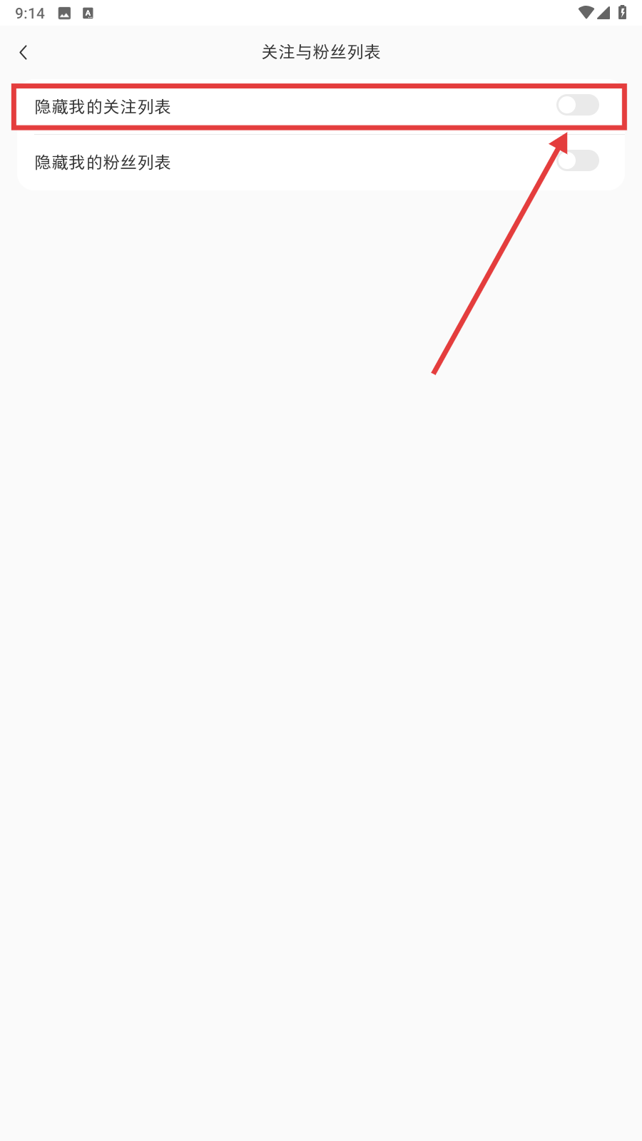 4、在【关注与粉丝列表】页面,我们点击【隐藏我的关注列表】右侧的开关,就可以设置关注不可见啦。
