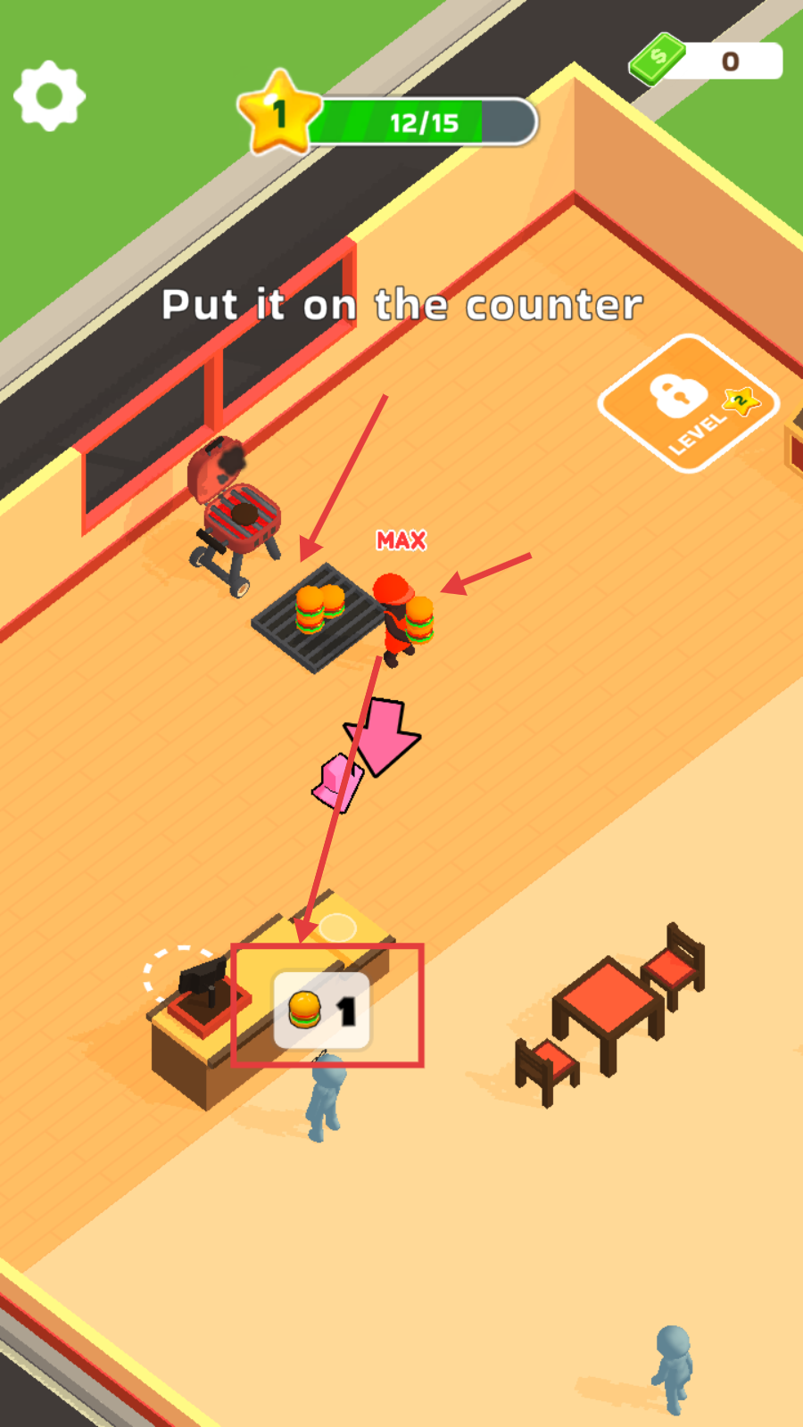 3、将汉堡放在柜台上给客人,按照提示【Putitonthecounter】完成操作。