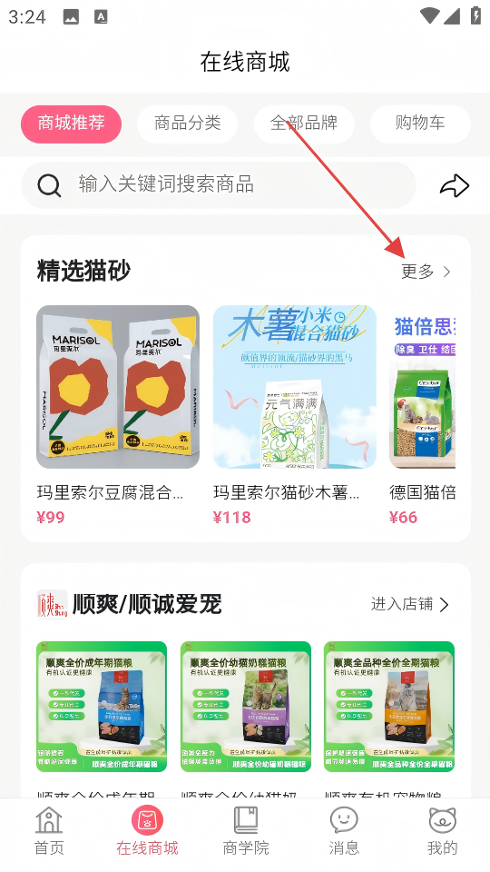 2、在在线商城页面,找到【精选猫砂】区域,点击【更多】按钮,进入精选猫砂列表页。