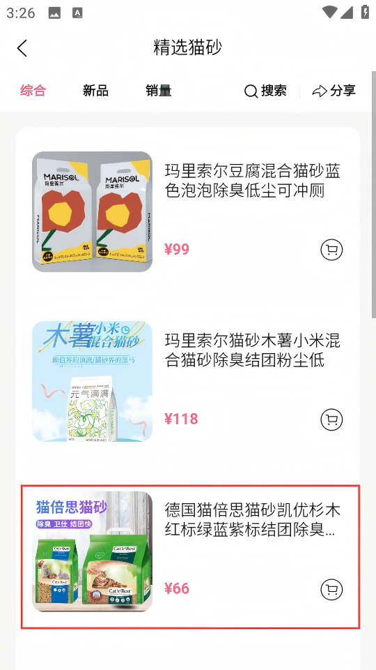 3、在精选猫砂列表页,选择【德国猫倍思猫砂】,点击进入商品详情页。