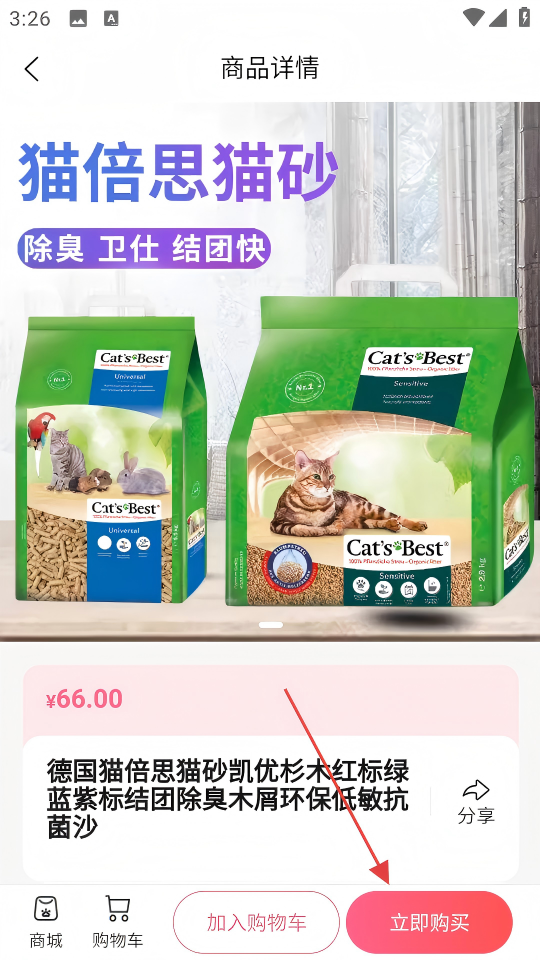4、进入【德国猫倍思猫砂】商品详情页后,可点击【立即购买】按钮直接购买。