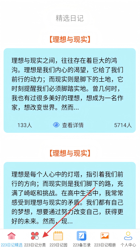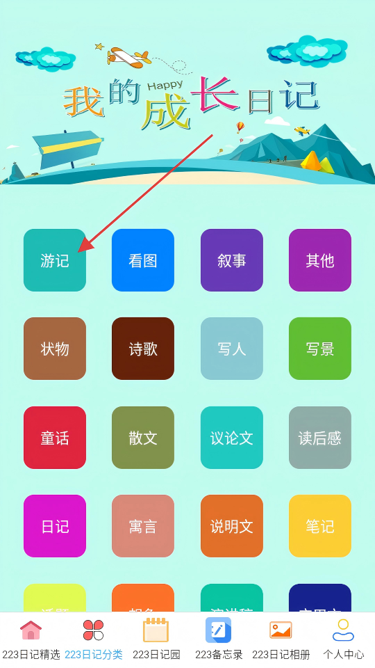 1、点击底部【223日记分类】,进入“我的成长日记”分类页面。