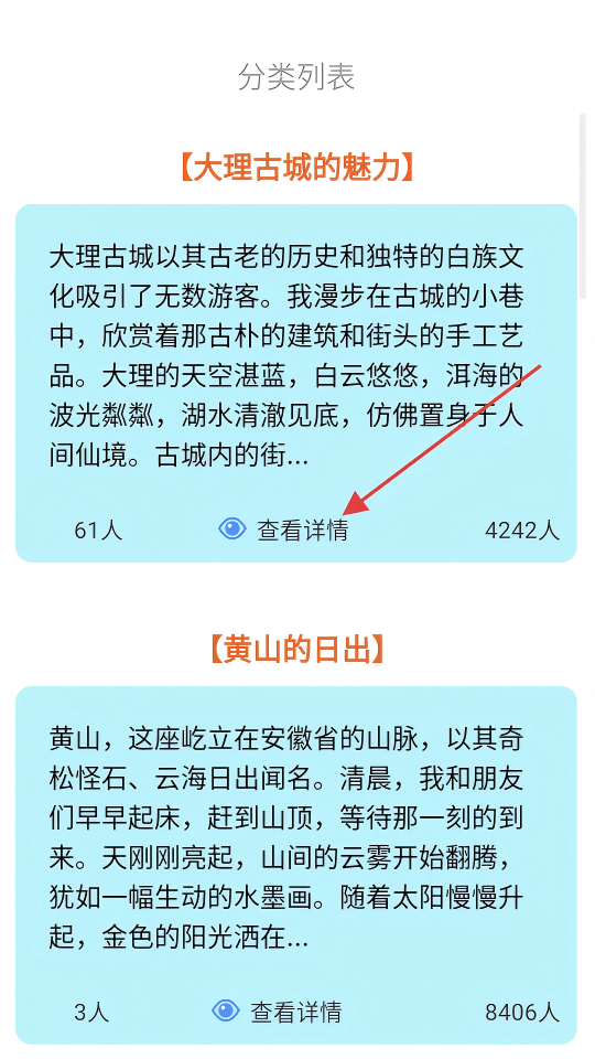 3、在列表中找到《大理古城的魅力》,点击【查看详情】。