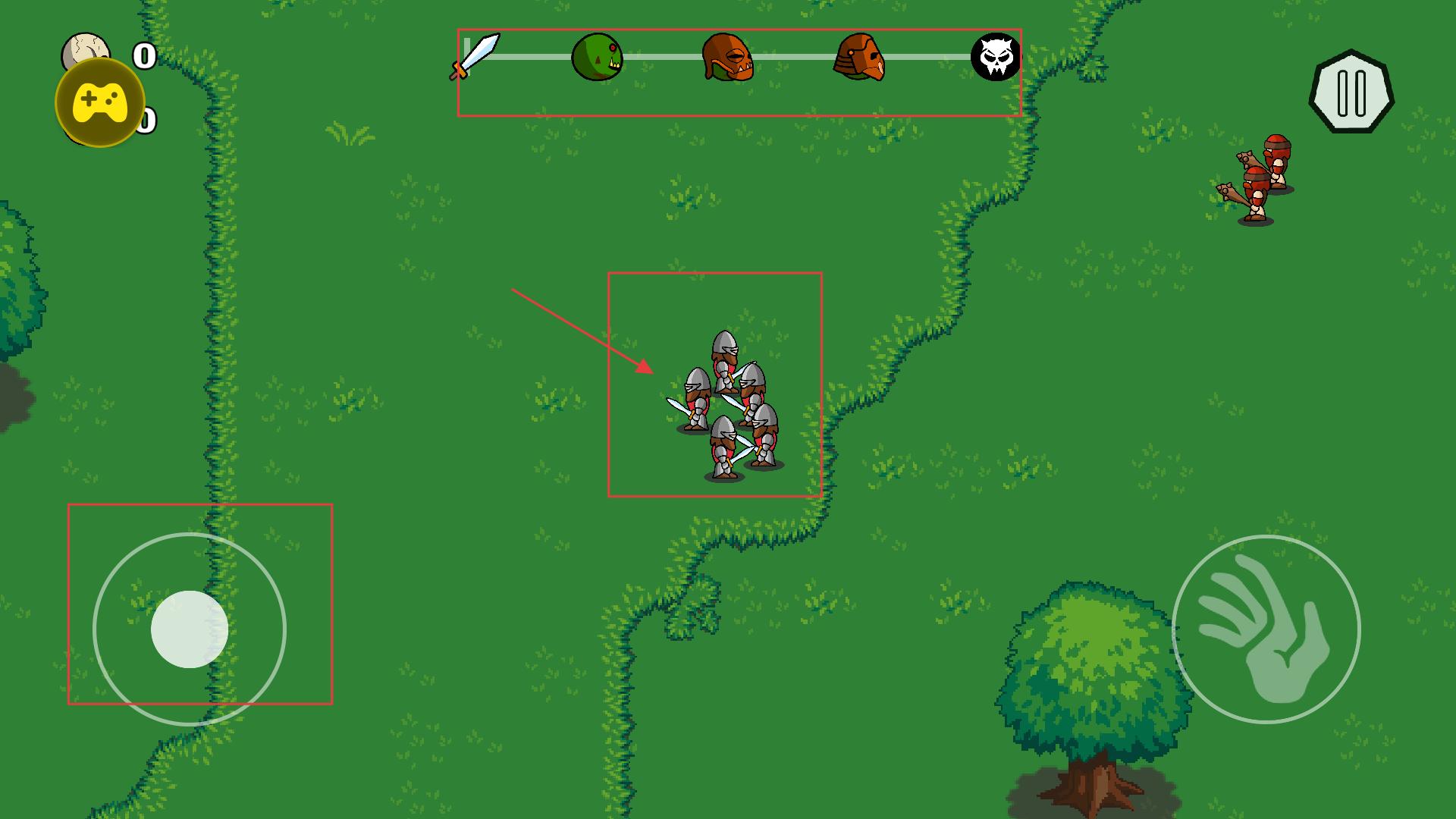 1、战斗中通过左侧摇杆控制剑士军团移动,靠近敌方单位触发近战战斗,利用军团数量优势快速击破单个目标,积累击杀数。