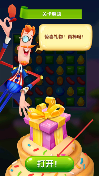4、在礼物界面里,点击【打开!】按钮,开启关卡奖励礼盒,获取惊喜礼物。