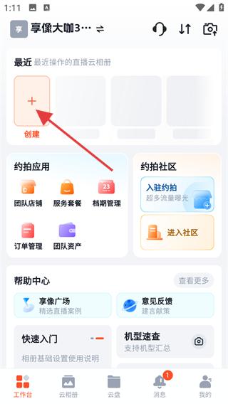 1、进入享像派云相册页,点击【+】按钮,进入创建云相册的功能选择界面。