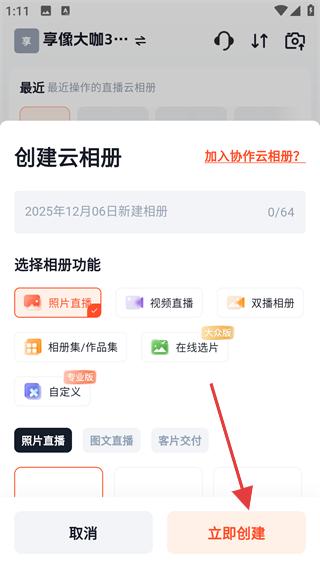 2、在创建云相册界面选择功能(如照片直播),点击【立即创建】生成新相册。