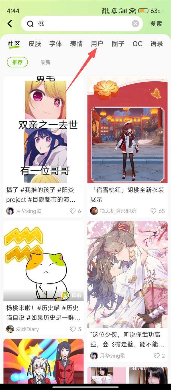 3、搜索结果加载后,点击【用户】分类标签,筛选出目标用户列表,这样就能快速定位到要关注的人啦。