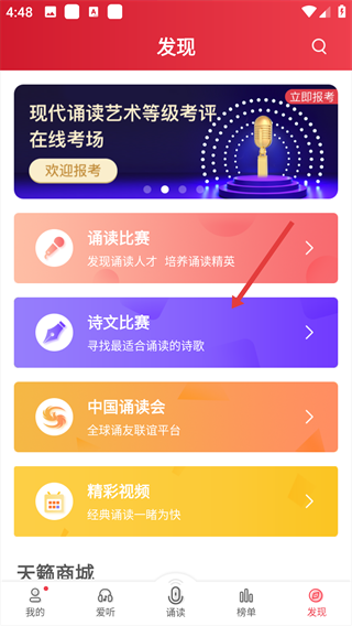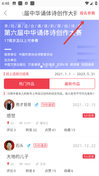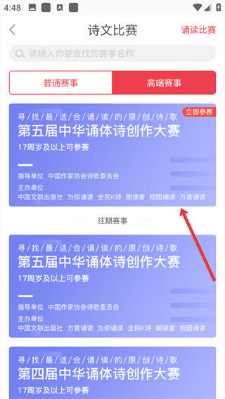 3、进入诗文比赛页面,选择目标赛事,进入该赛事的详情页面。