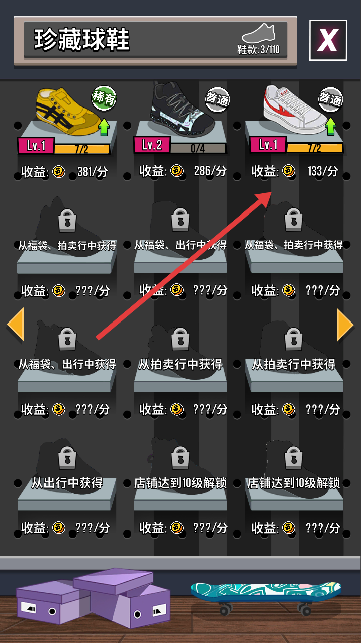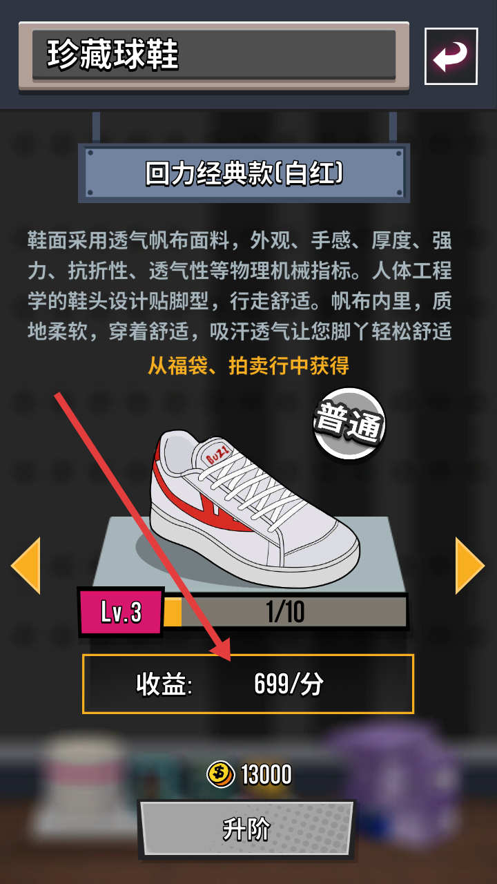 4、升阶后,回力经典款白红球鞋等级提升至Lv.3,收益提升至699/分,继续经营店铺提升总收益。