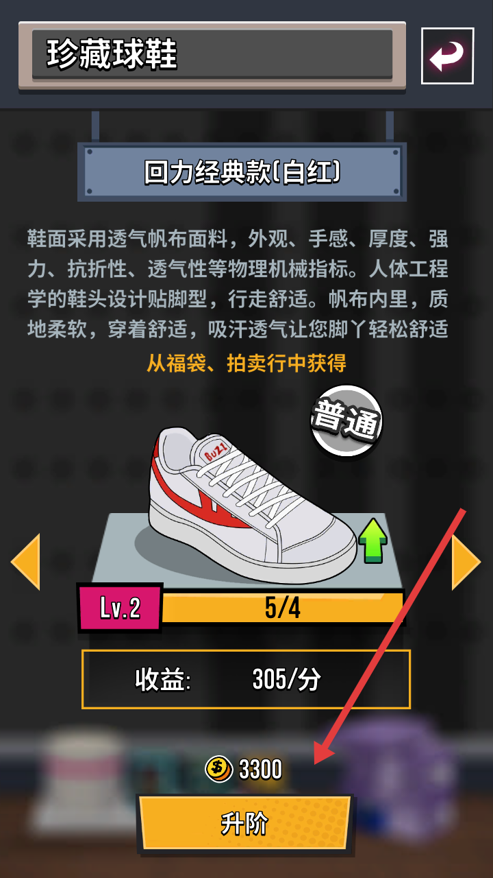 3、花费3300金币对回力经典款,白红球鞋进行升阶操作,提升其等级。
