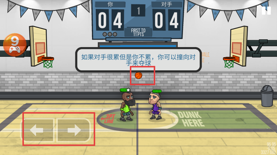 1、操控方向键,当对手很累但你不累时,撞向对手夺球,开启篮球对战。