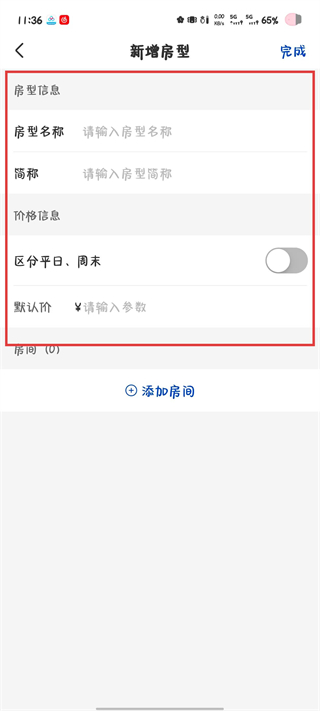 4、依次填写房型名称简称价格信息等内容,补充后点击完成保存房型信息。