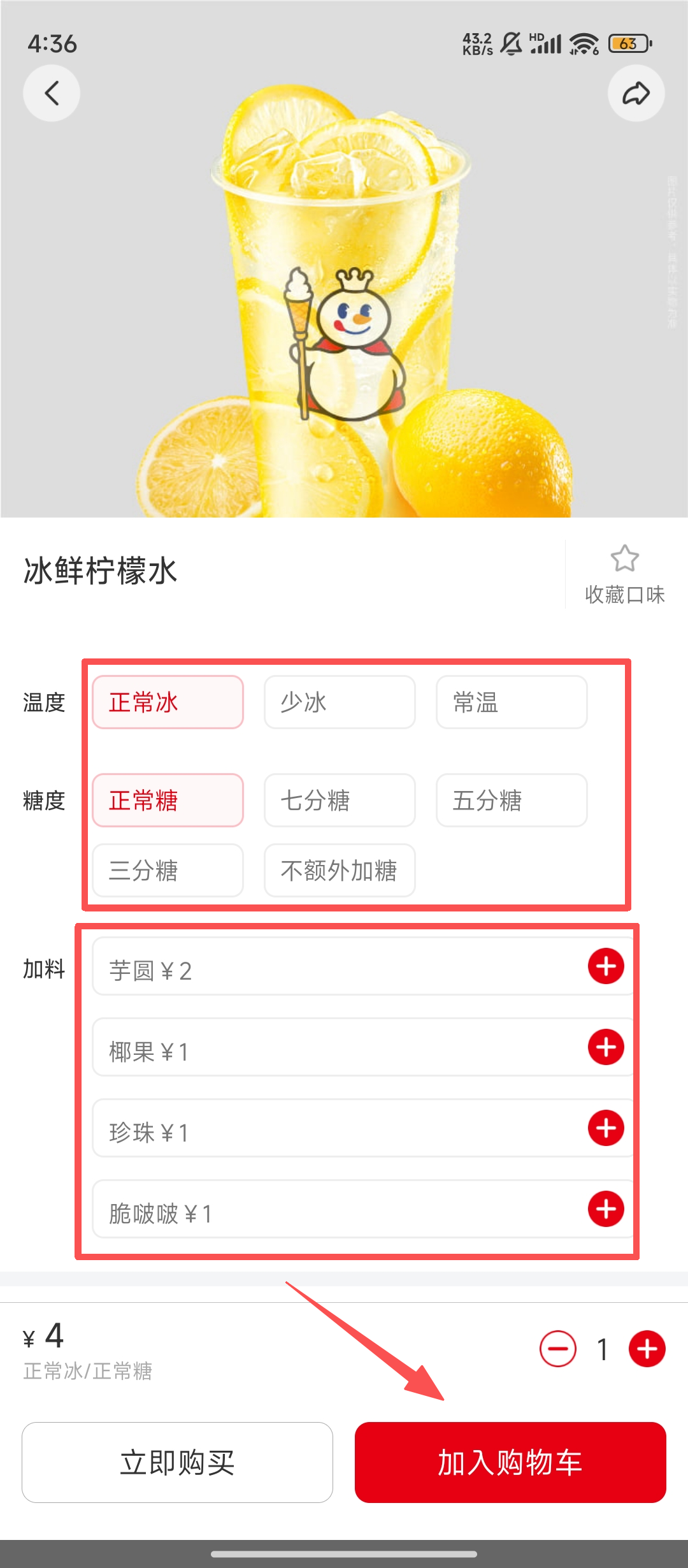 3、进入饮品详情页,选好温度、糖度,若要加料也可选择,随后点击【加入购物车】,为结算做准备啦。