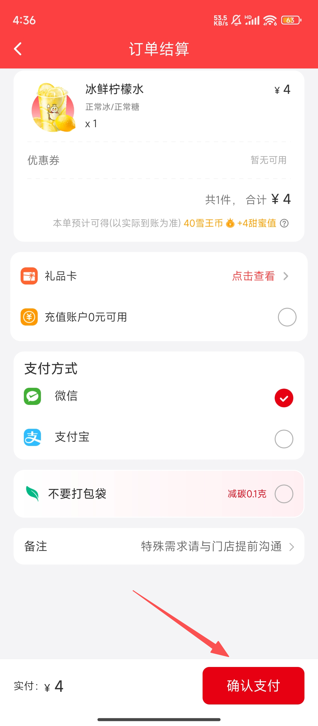 4、进入订单结算页面,选好支付方式,确认订单信息无误后,点击【确认支付】,就能完成点单啦。