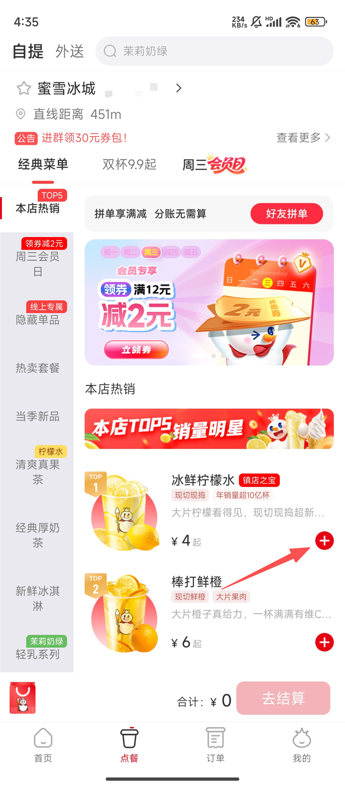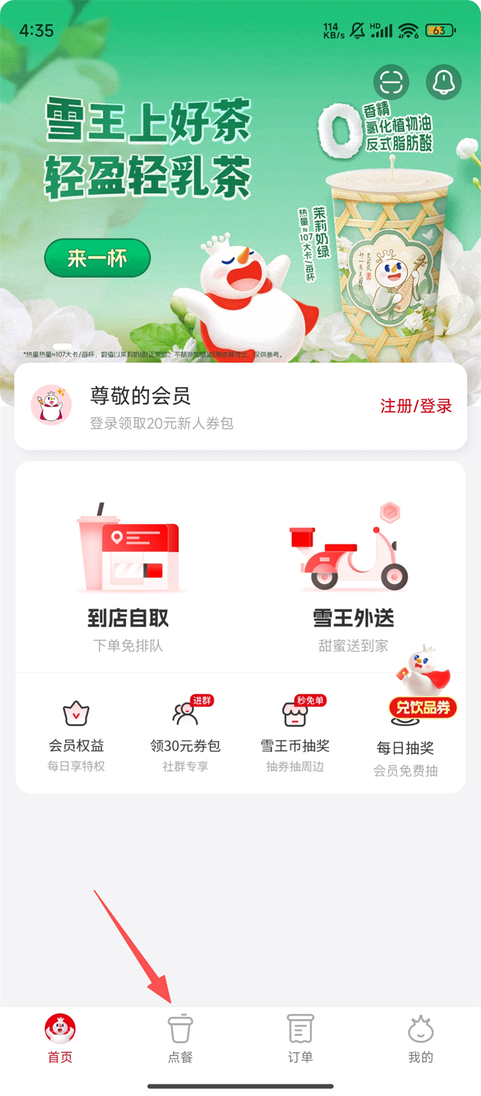 1、打开蜜雪冰城App首页,点击底部【点餐】按钮,便可进入点餐页面挑选饮品啦。