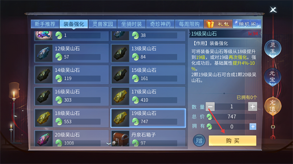 3、在【装备强化】分类中,有不同级别的吴山石。