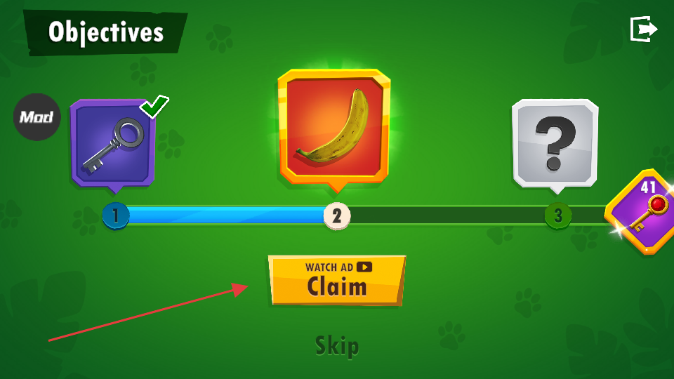 3、在目标界面,可通过观看广告点击【Claim】领取香蕉奖励,也可选择【Skip】跳过,继续完成后续目标。