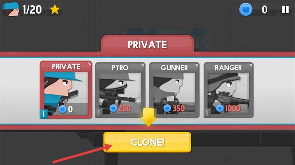 1、在单位界面选择“PRIVATE”后,点击下方“CLONE!”按钮,消耗资源克隆出更多该单位士兵,朝着凑齐20个单位的目标推进。
