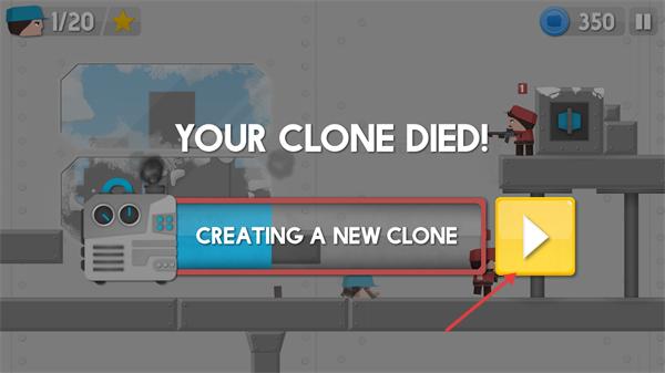 4、若士兵阵亡,界面会提示,此时点击黄色按钮可触发“CREATINGANEWCLONE”,补充新的士兵继续推进关卡。