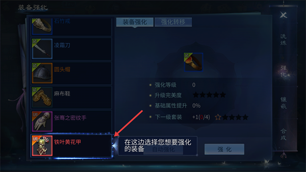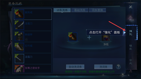 2、点击右侧【强化】面板,切换到装备强化功能。