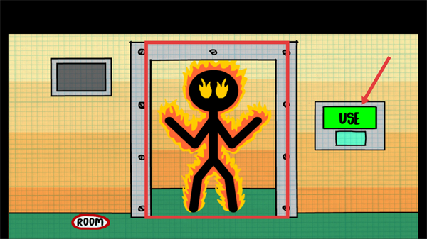 2、当红色框内出现火焰火柴人怪物在门口时,点击红色箭头指向的【USE】按钮,触发关门操作。