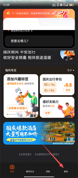 1、打开嘀嗒出行软件,在首页点击右下角【我的】。