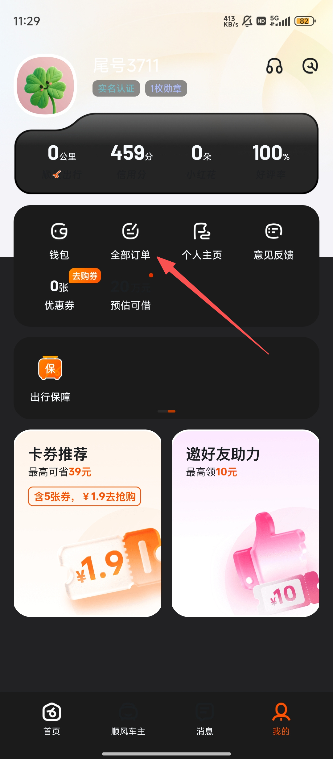 2、在【我的】页面里,找到【全部订单】选项,点击它就能查看乘车相关记录咯。