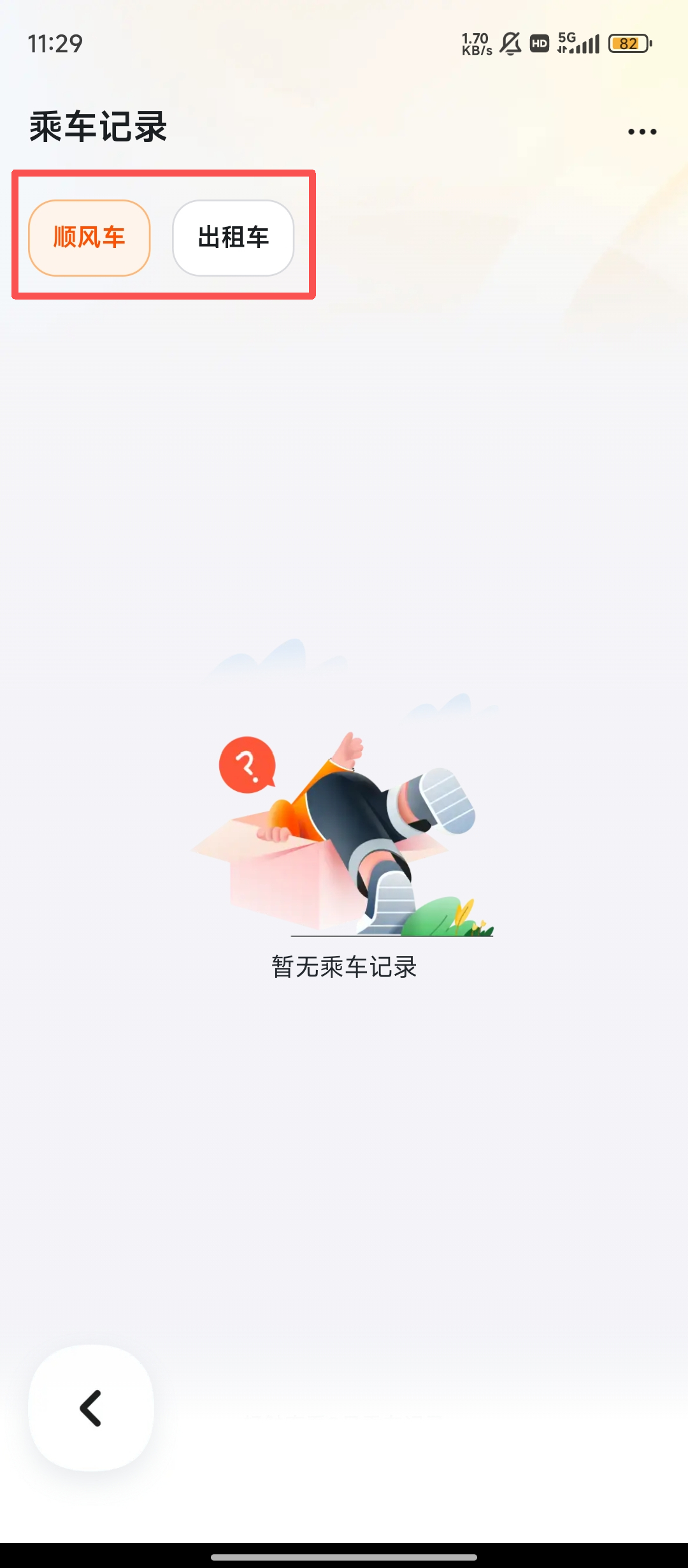 3、进入订单页面后,能看到【顺风车】和【出租车】两个选项,可根据需求切换查看对应的乘车记录。