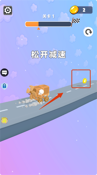 3、行驶中留意【松开减速】的提示,合理控制车速,同时收集道路上的金币,积累资源。
