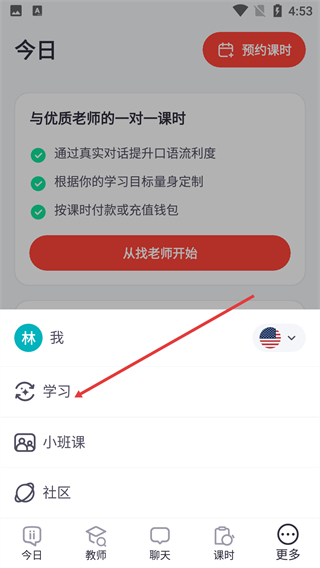 2、在展开的功能菜单中,点击【学习】选项,进入包含多种学习功能的页面。