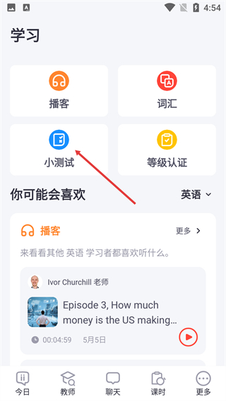 3、在学习页面,点击【小测试】选项进入测试练习页面。