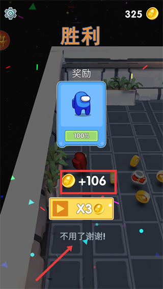 4、胜利后会获得【+106】金币奖励,可点击下方按钮直接领取,或看广告获取更多金币。