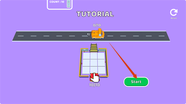 1、在【TUTORIAL】教程界面,点击【Start】按钮开始游戏,此阶段需熟悉车辆与道具的运作机制,为后续关卡铺垫。