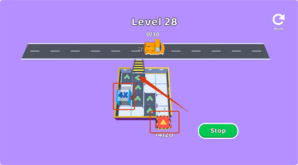3、合理布局带有【4X】标识的道具区域,利用方向箭头道具引导车辆,提升运输效率。