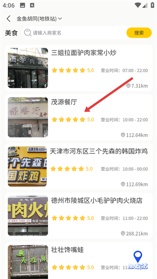 3、在美食列表中,选择【茂源餐厅】,进入其详情页,查看营业时间、地址等信息哦。