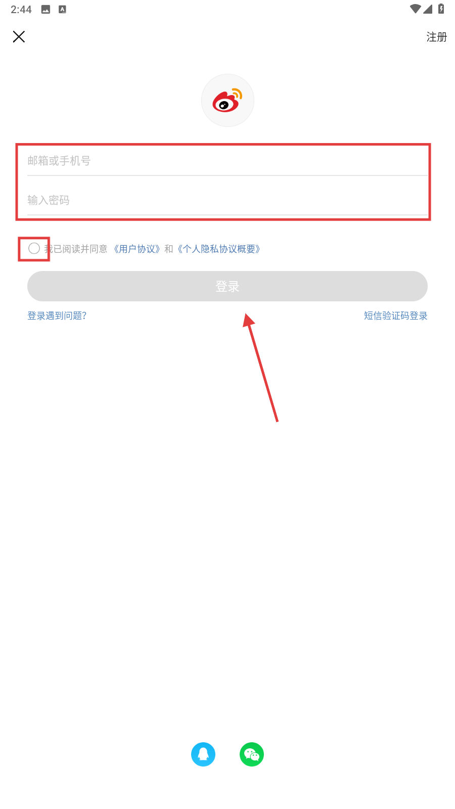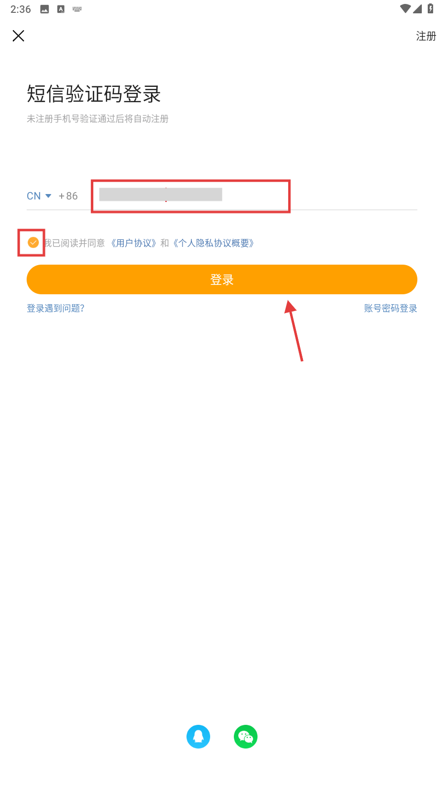 1、我们进入登录界面,选择【短信验证码登录】方式,在输入框中填入我们的手机号,然后勾选条款,再点击【登录】按钮。