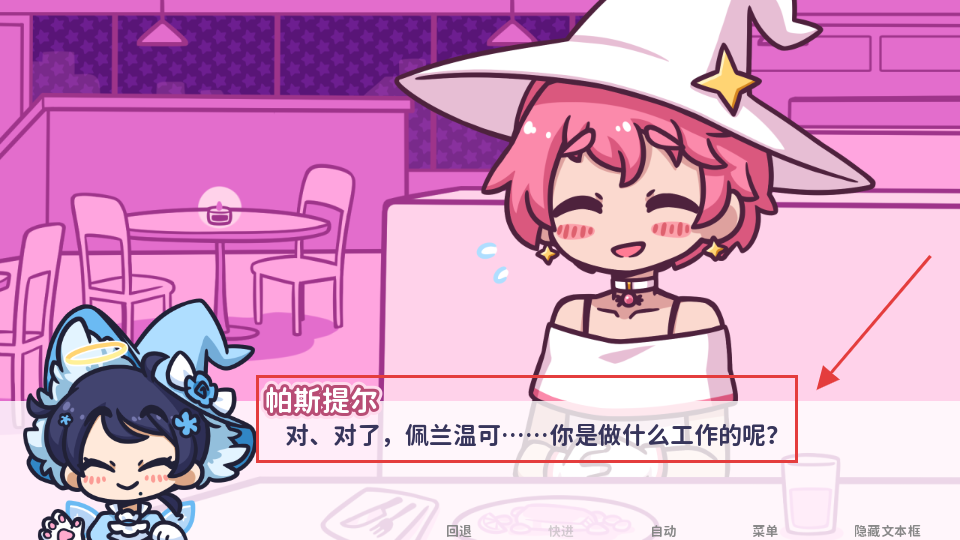 1、点击屏幕推进【帕斯提尔】的对话,了解角色工作信息,界面含【回退】-【快进】-【自动】-【菜单】-【隐藏文本框】功能。